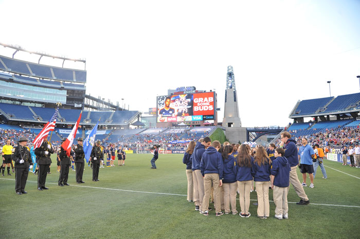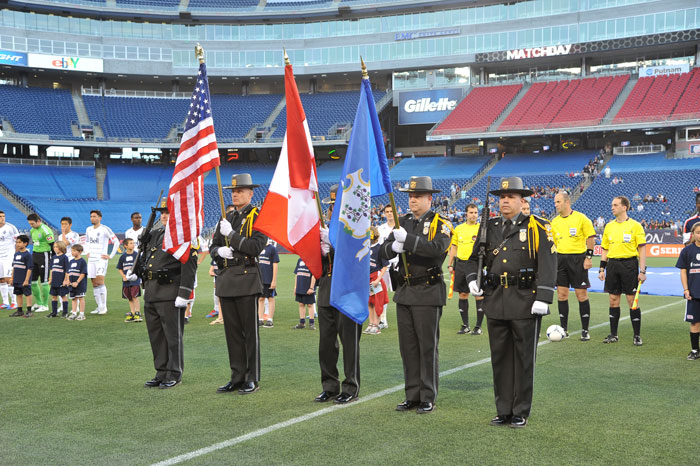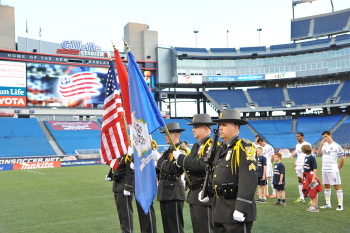 05/12/2012 - The State Capitol Police Department's Honor Guard presents flags for the National Anthem ceremony for the New England Revolution vs. Vancouver Whitecaps FC soccer match at Gillette Stadium.