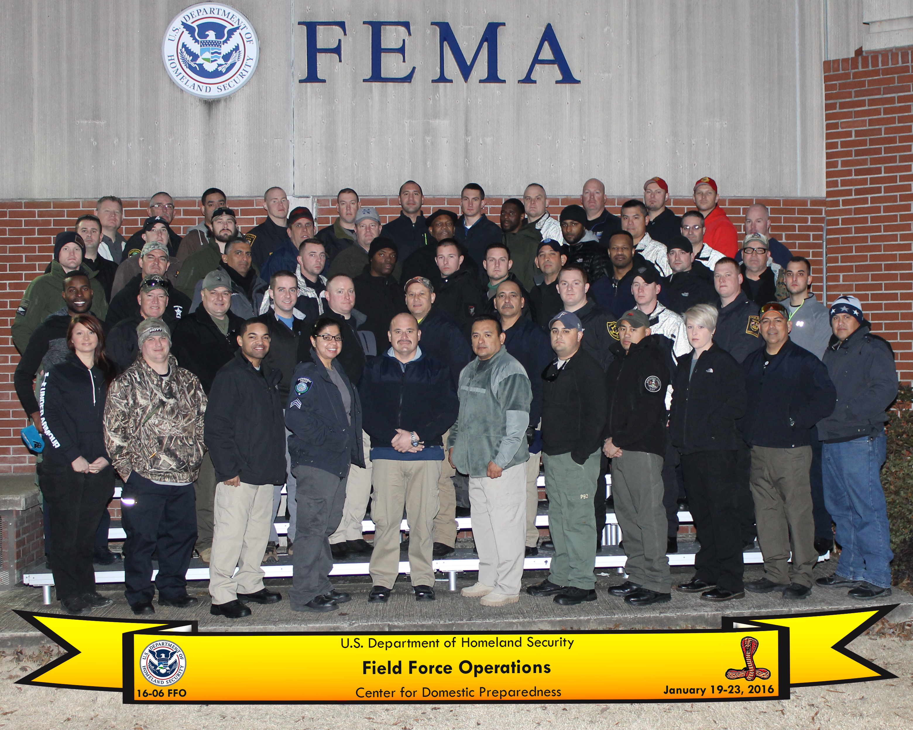 01/19-23/2016 - On a Homeland Security Grant Sergeant Timothy Francis Boyle and Corporal J.B. O'Reilly attended Field Force Operations Training at the Center for Domestic Preparedness in Anniston Alabama. The course was attended by law enforcement nationwide and covered the dynamics of, and response to large scale events including protests and riots. Both officers performed at the highest of levels during the training and graduated with certificates in this field.