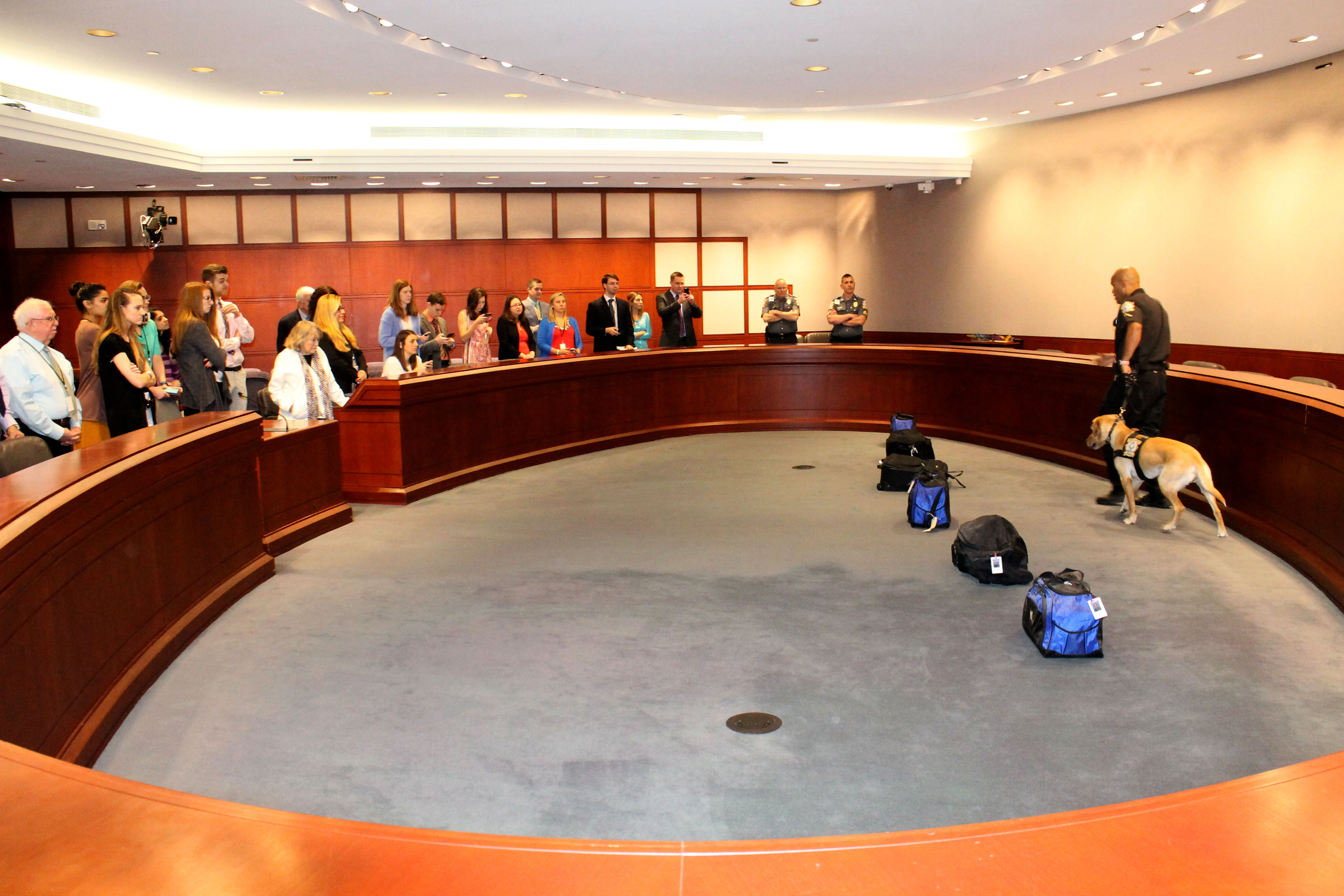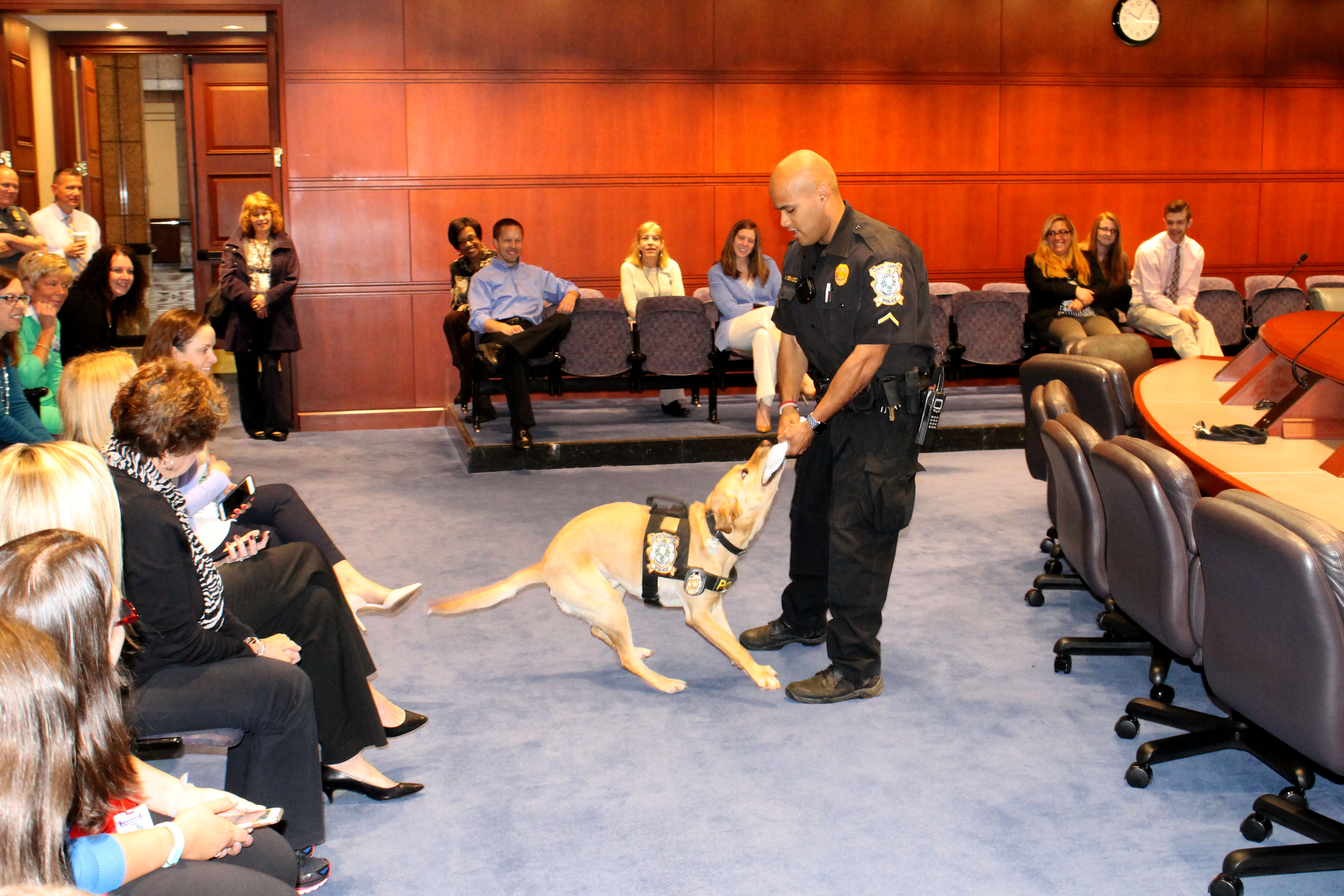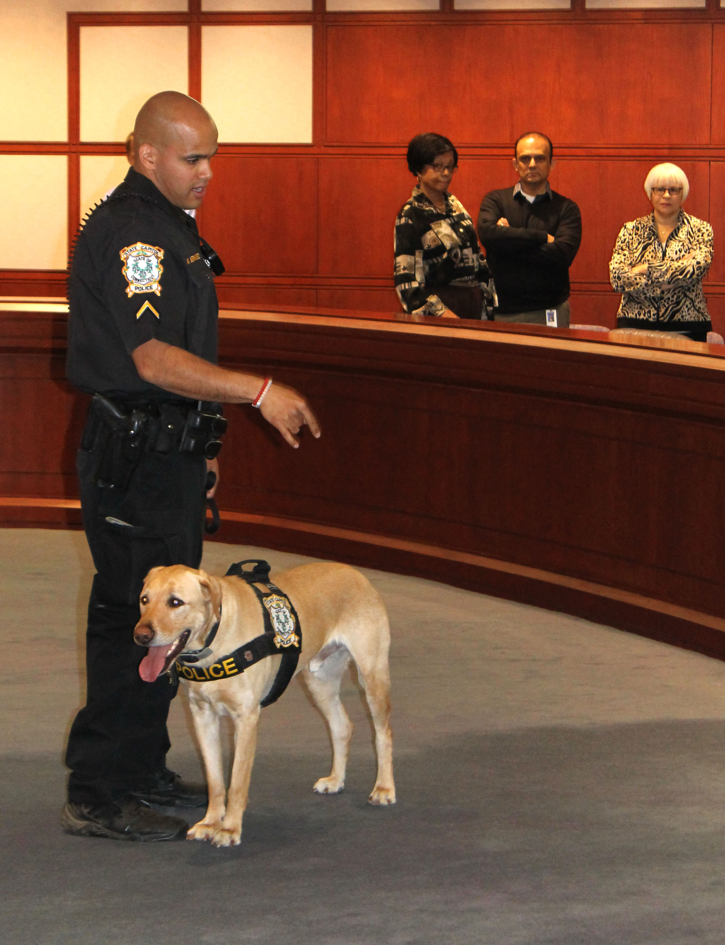 05/05/2017 - The Connecticut State Capitol Police Department held a meet and greet with Officer First Class Michael Bermudez and his K-9, "Cutter". A K-9 demonstration was held in Hearing Room 1E after the meet and greet. Officer First Class Michael Bermudez and Cutter graduated the Boston Police Department's explosive detecting K-9 program. This K-9 team is a first for the State Capitol Police Department. K-9 Cutter is used to sniff packages and areas of the Capitol complex. The State Capitol Police are excited to have this team available in this specialized area of police work.