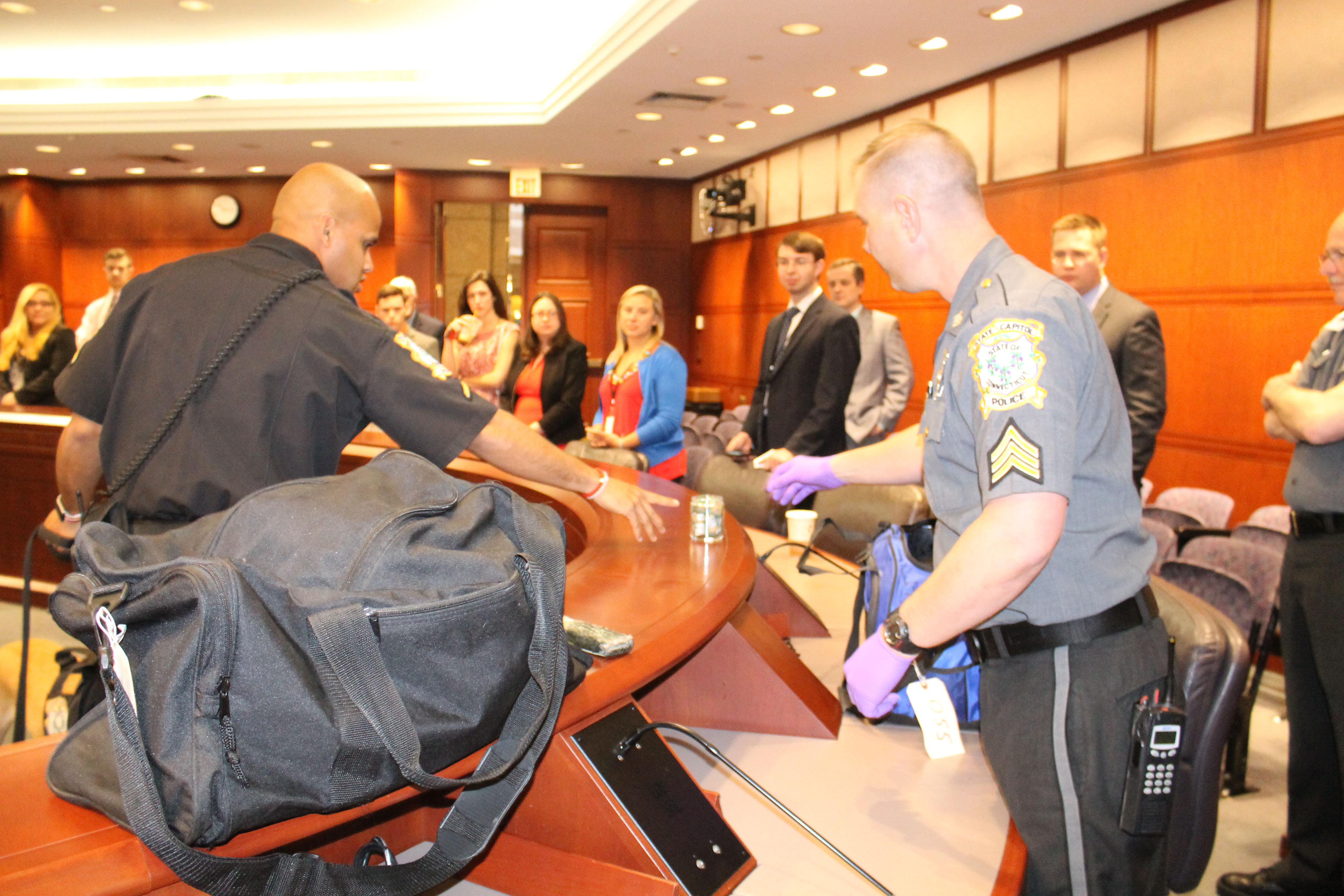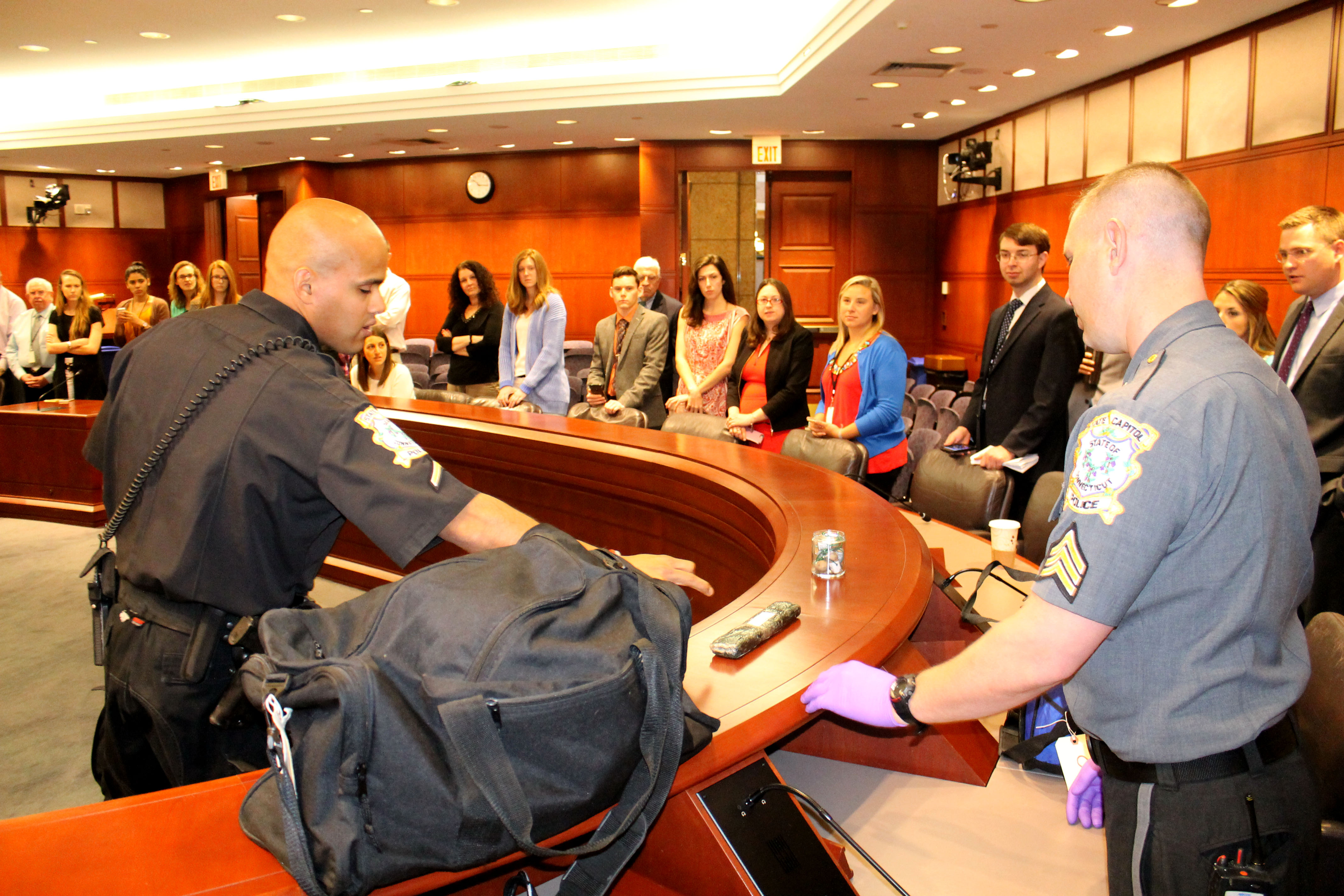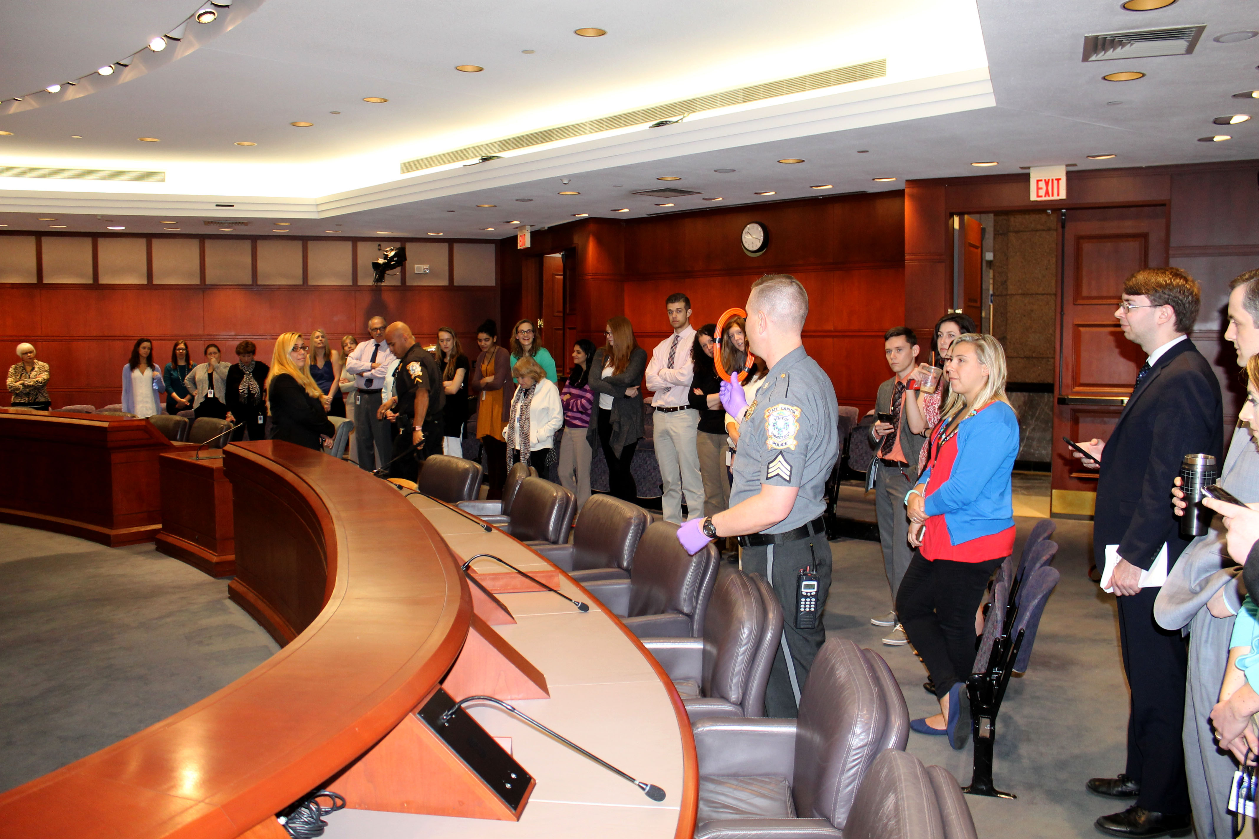 05/05/2017 - The Connecticut State Capitol Police Department held a meet and greet with Officer First Class Michael Bermudez and his K-9, "Cutter". A K-9 demonstration was held in Hearing Room 1E after the meet and greet. Officer First Class Michael Bermudez and Cutter graduated the Boston Police Department's explosive detecting K-9 program. This K-9 team is a first for the State Capitol Police Department. K-9 Cutter is used to sniff packages and areas of the Capitol complex. The State Capitol Police are excited to have this team available in this specialized area of police work.