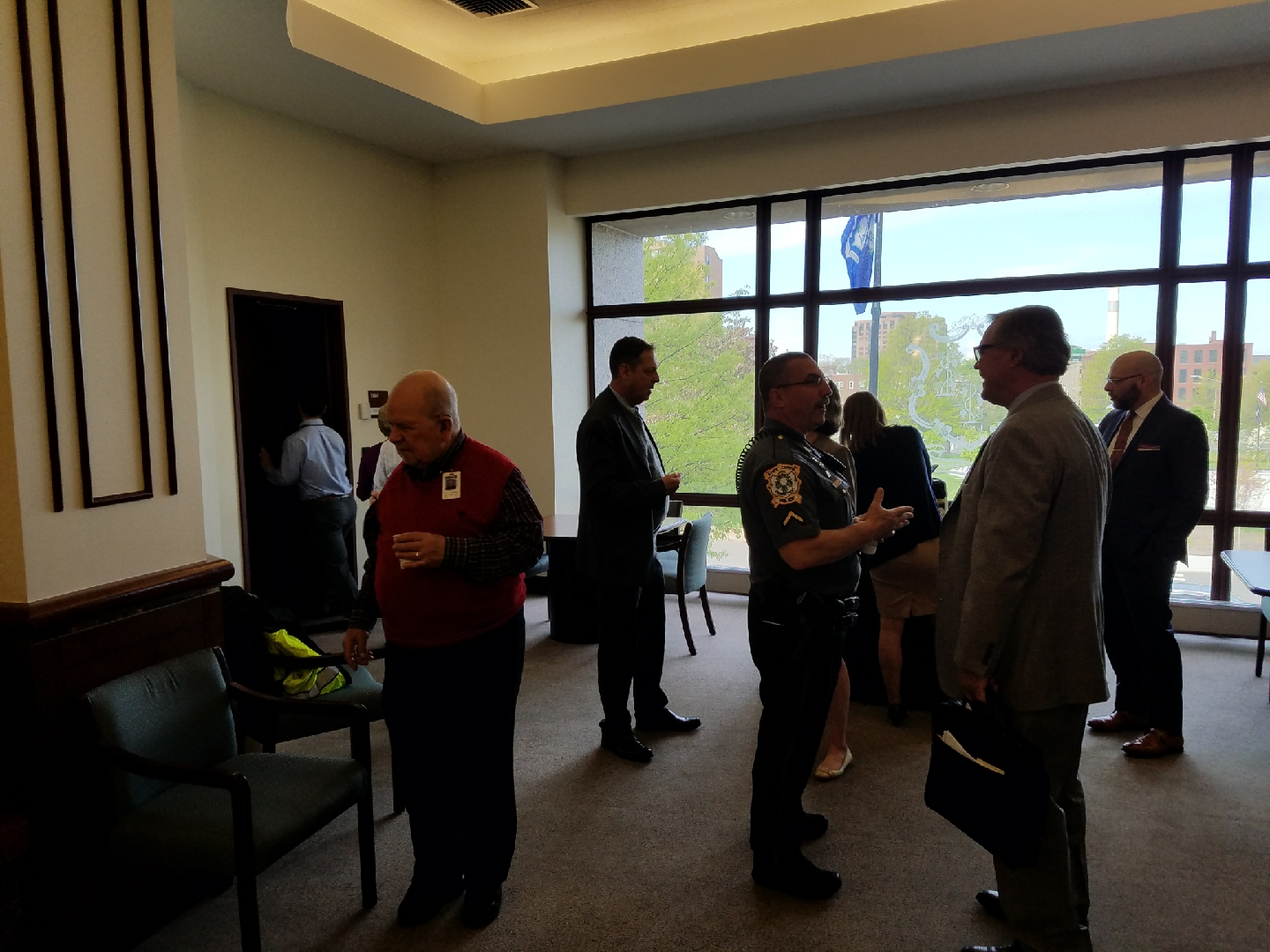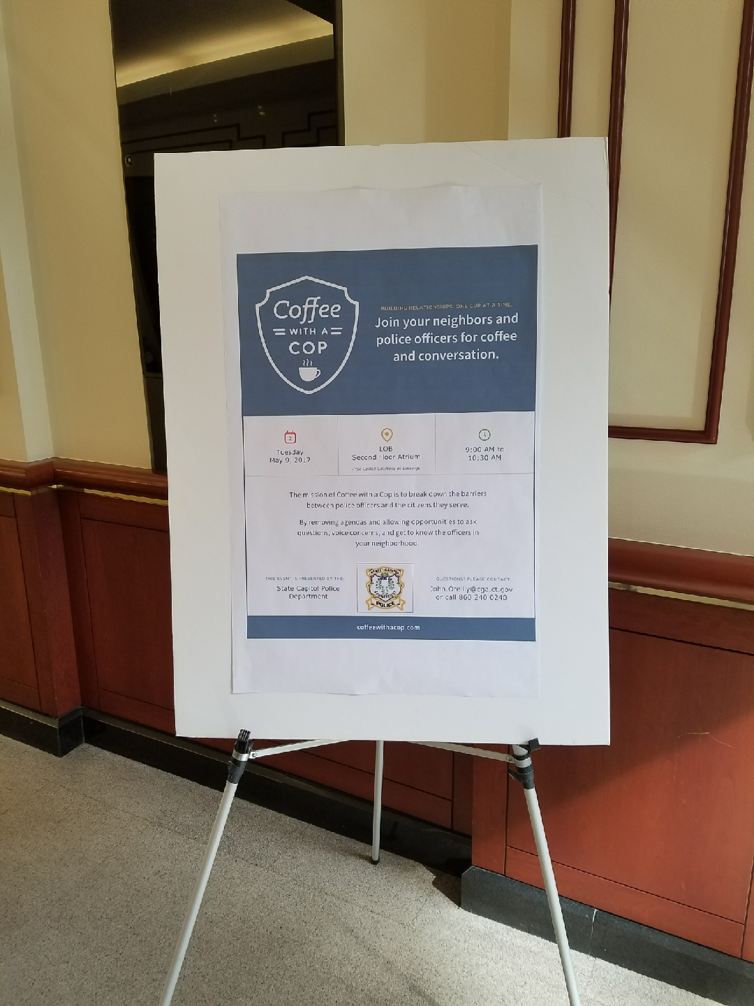 05/09/2017 - The State Capitol Police held a Coffee with a Cop event at the Legislative Office Building. The mission of Coffee with a Cop is to break down the barriers between police officers and the citizens they serve by removing agendas and allowing opportunities to ask questions, voice concerns and get to know officers in your service area. The event was well attended.