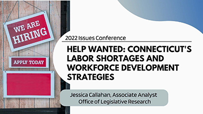 Who's hiring? Certain occupations in the state are facing hiring and retention challenges. This presentation will highlight Connecticut's in-demand sectors with a focus on those facing the highest number of labor shortages. Workforce development, job training, and incentive programs recently implemented by the legislature will be discussed, in addition to strategies and programs the legislature may choose to pursue in the upcoming 2023 session.